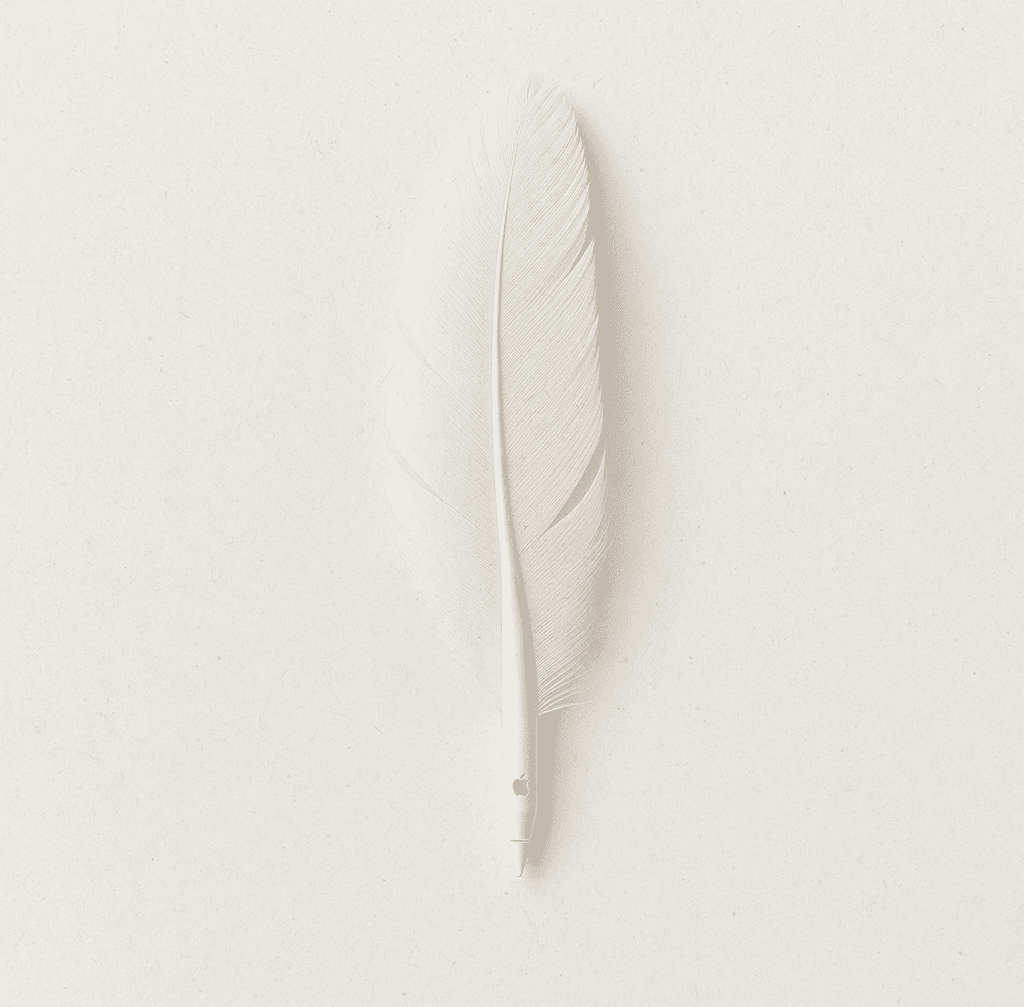 Natural white feather shaft, integrated matte plastic pen body, stainless steel pen tip, subtle embossed logo mark.