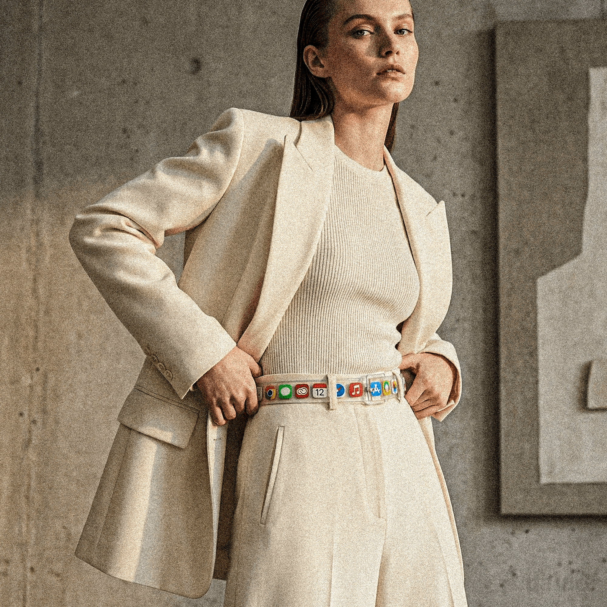 Clear TPU belt strap, printed high-resolution app icon inlays, transparent polycarbonate buckle, stitched canvas belt loops.